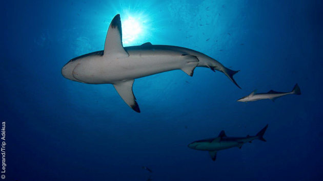 Si je vous dis “Monoï, cocotiers et... requins” ! Vous voyez ? C'est bien en Polynésie que nous allons tremper nos palmes, là où les requins font littéralement partie du paysage sous-marin.
