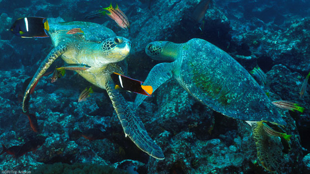 On trouve aux Galapagos une Nature à la fois généreuse et originale, avec un nombre d'espèces endémiques vraiment élevé. Des espèces qui n'existent qu'aux Galapagos ! Les sites de plongée sous-marine y sont tous plus incroyables les uns que les autres. On y voit facilement des requins, des otaries, de nombreuses tortues, des raies mantas, et bien entendu une grande quantité d'espèces de poissons. On en prend littéralement plein les yeux à chaque plongée aux Galapagos.